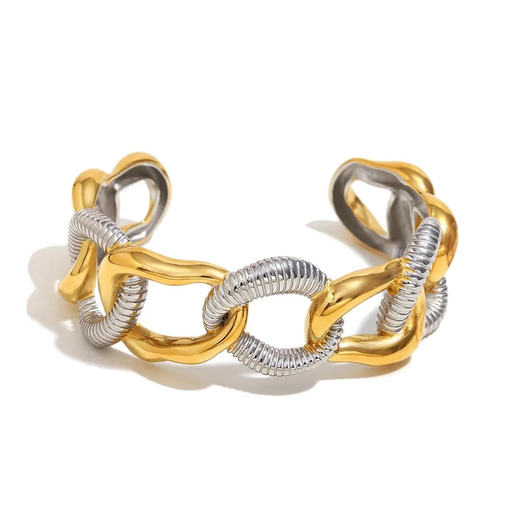 The Amber Charlotte bracelet is a striking combination of gold and silver-toned links, creating a bold yet sophisticated chain design. Perfect for making a modern, powerful statement.