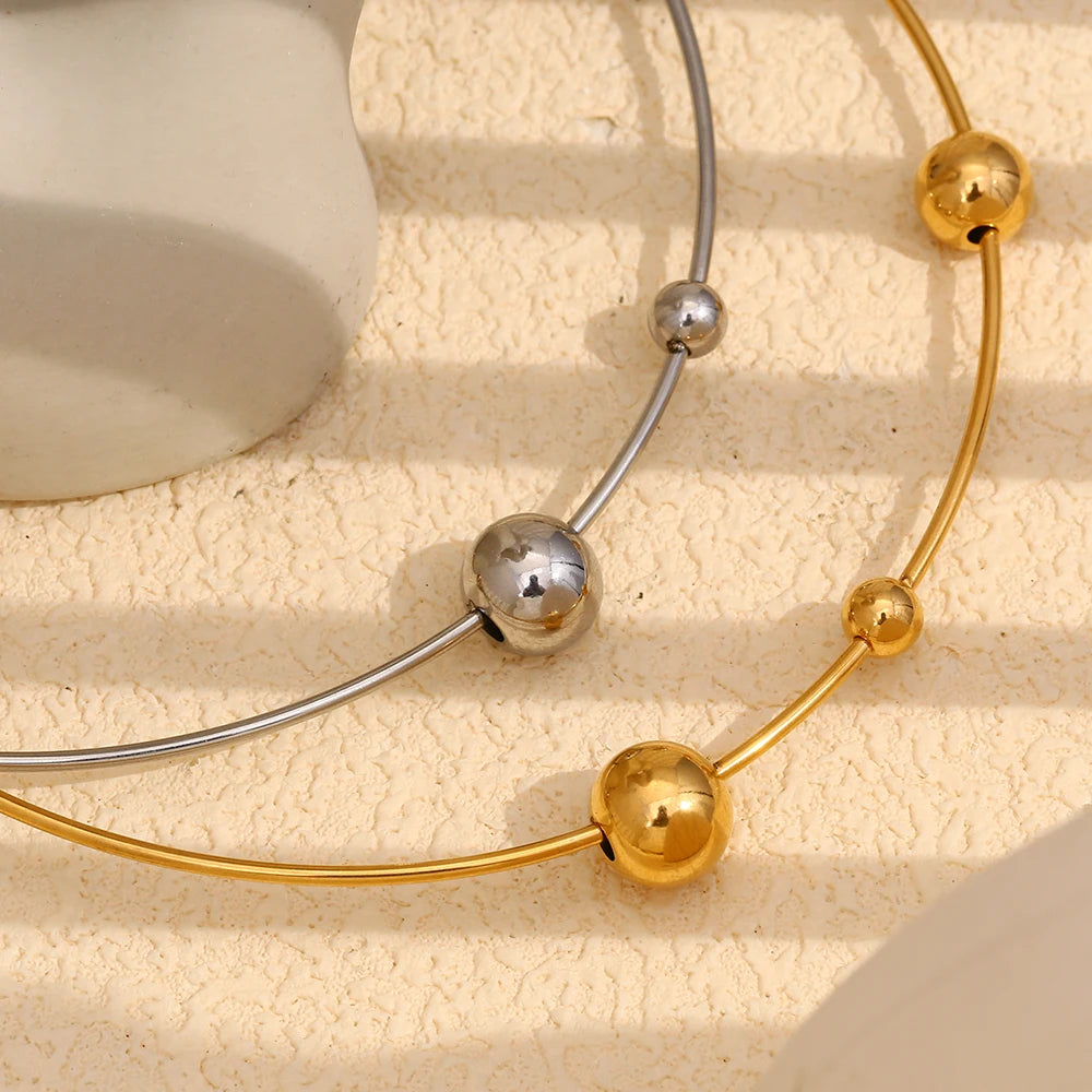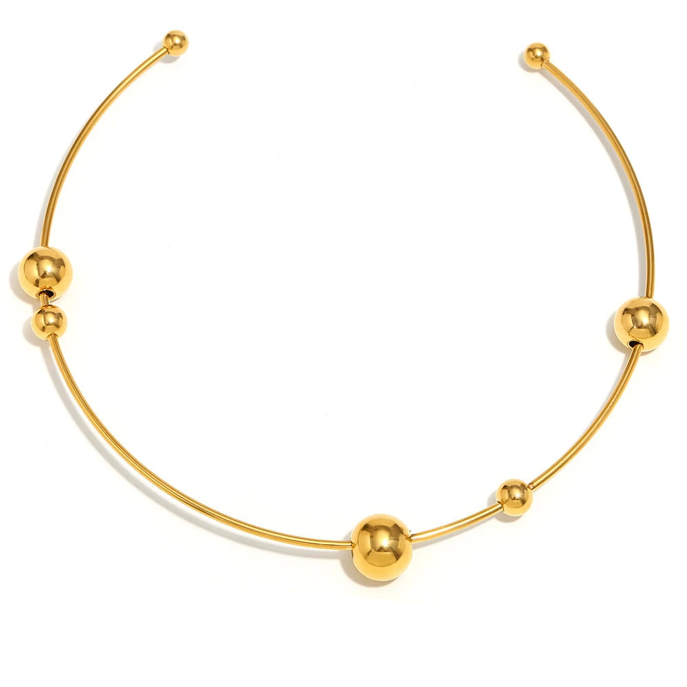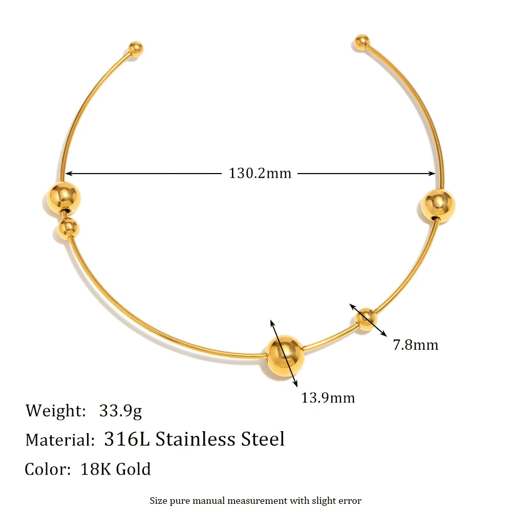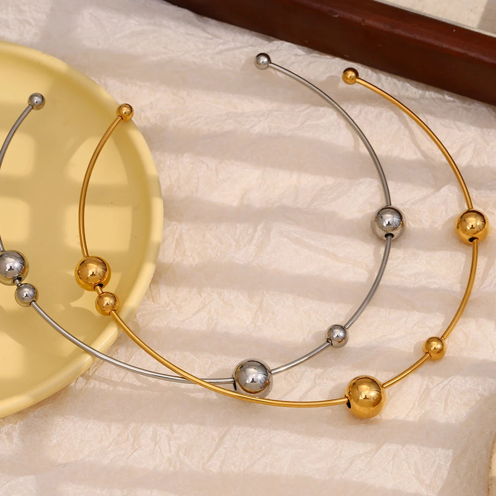 The Azure Grace bracelet is a vision of modern minimalism, featuring a sleek open band adorned with polished golden spheres. Its understated elegance makes it perfect for layering or wearing solo.