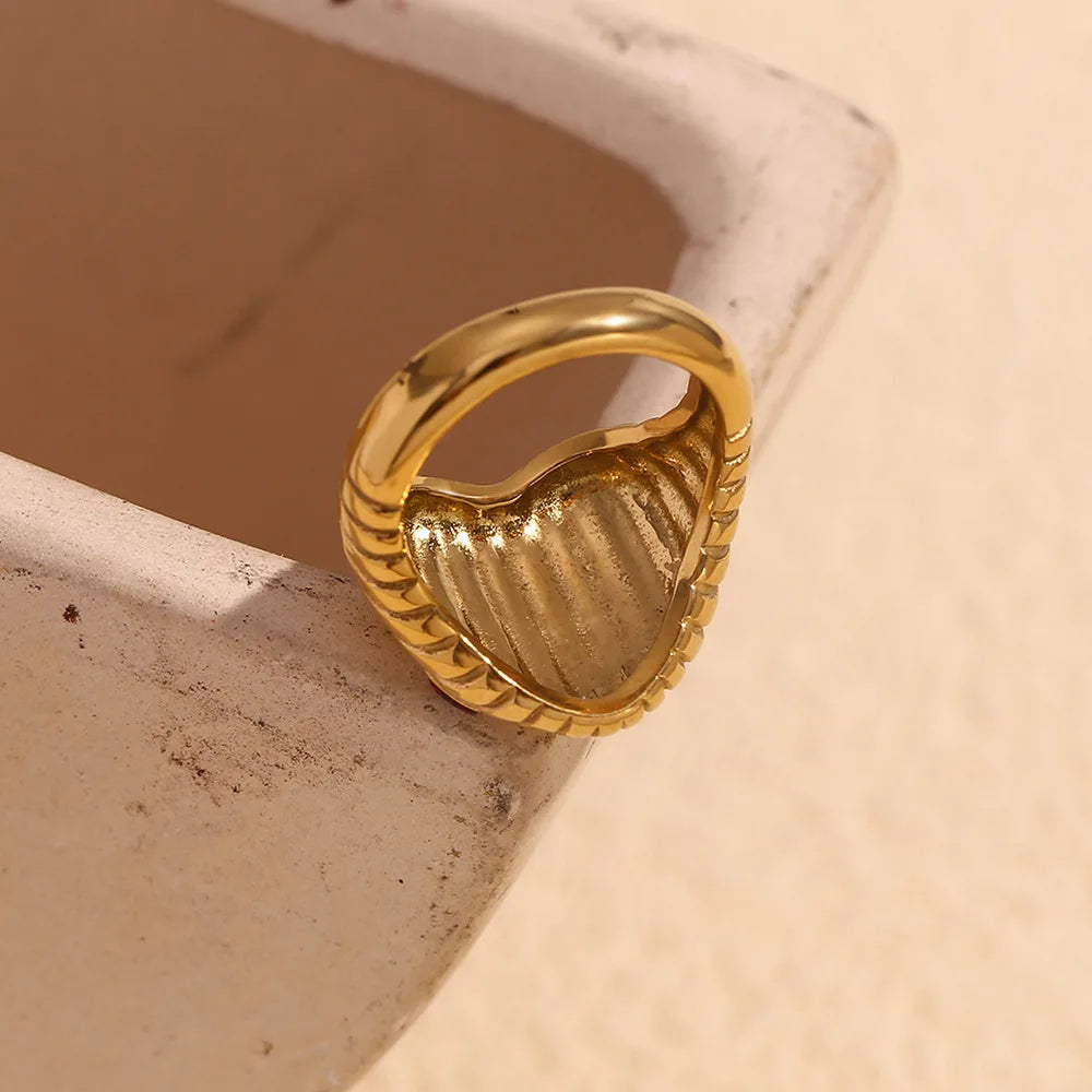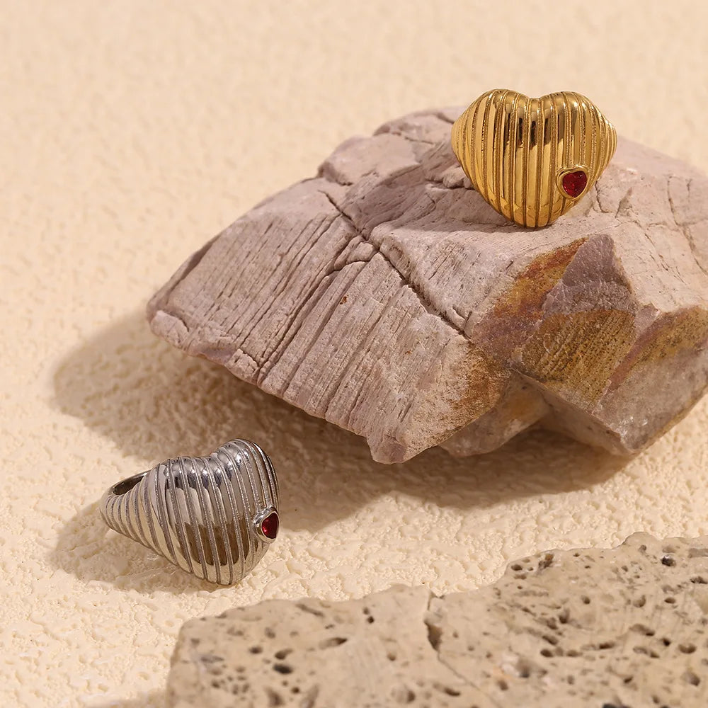 The Bloody Mary ring makes a bold statement with its ribbed golden heart, accented by a striking touch of deep red. Its unique design blends romance with modern edge, perfect for those who love pieces that stand out. Wear it to add a spark of passion and elegance to your look.