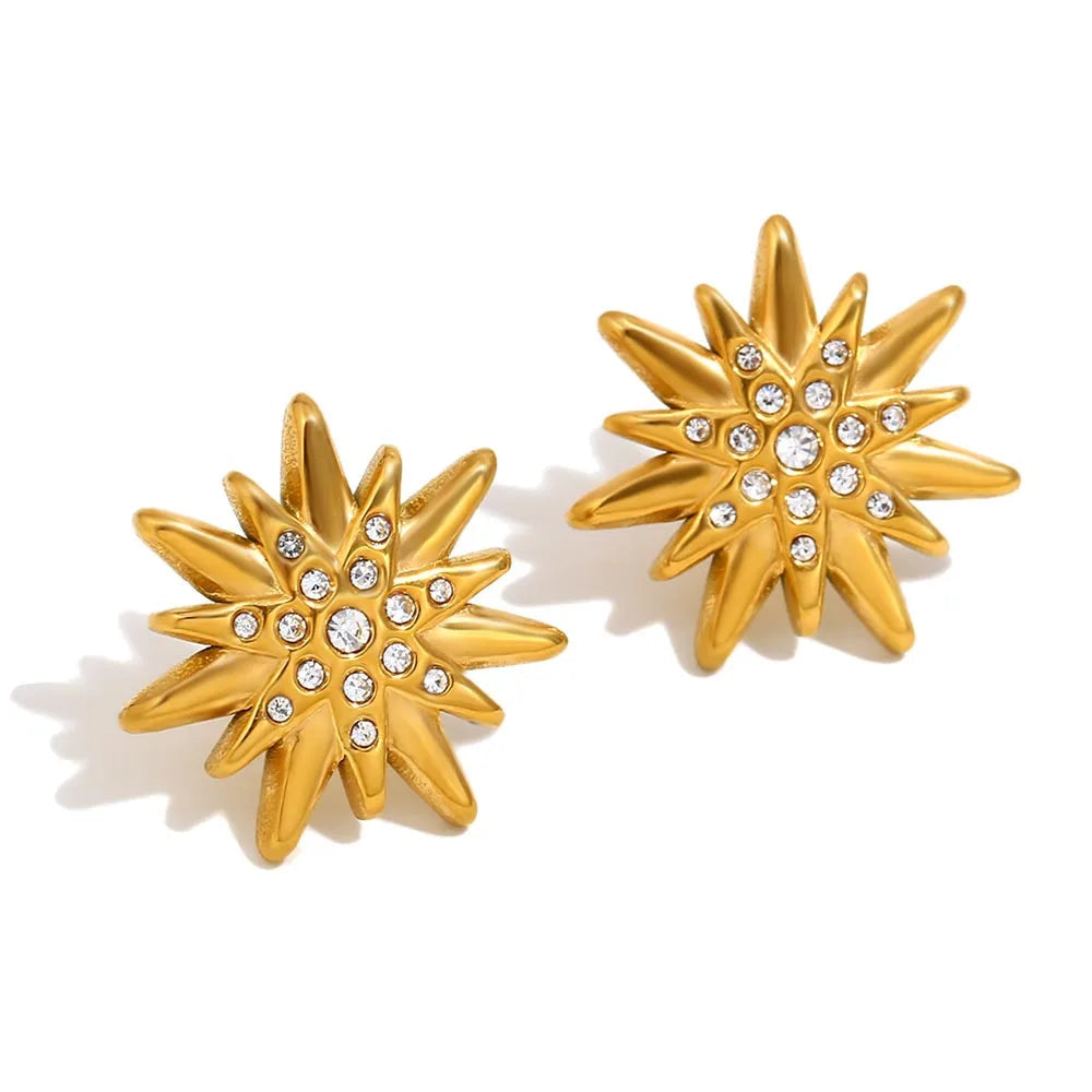 The Dazzling Amelia earrings sparkle like the night sky, with golden starbursts accented by shimmering crystals. A statement accessory for adding celestial glamour to any outfit.