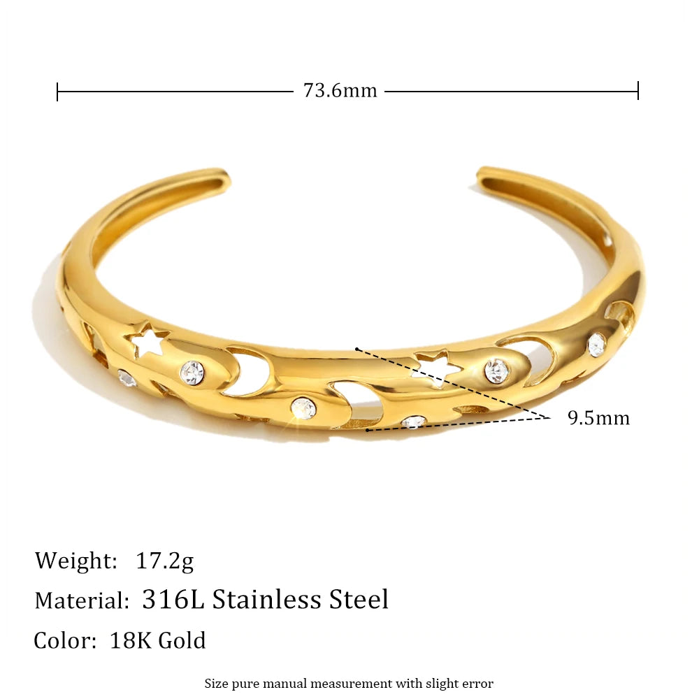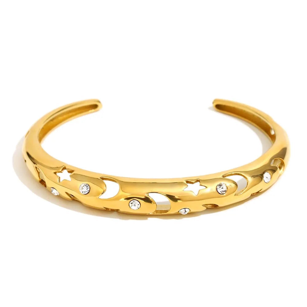 he Emerald Chloe bracelet captures celestial elegance with its golden band adorned with crescent moons and tiny sparkling stones. A graceful design perfect for adding a touch of night-sky magic to your style.
