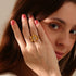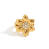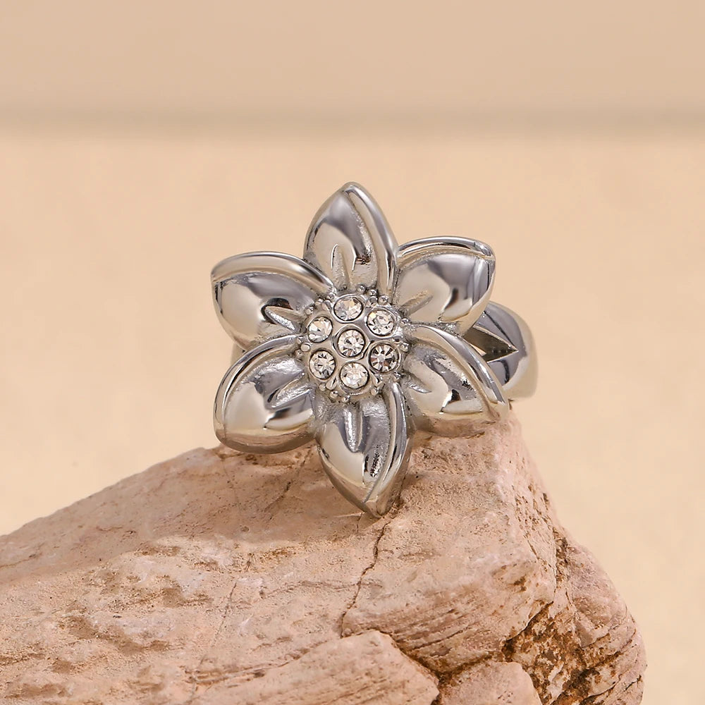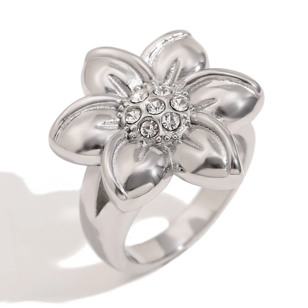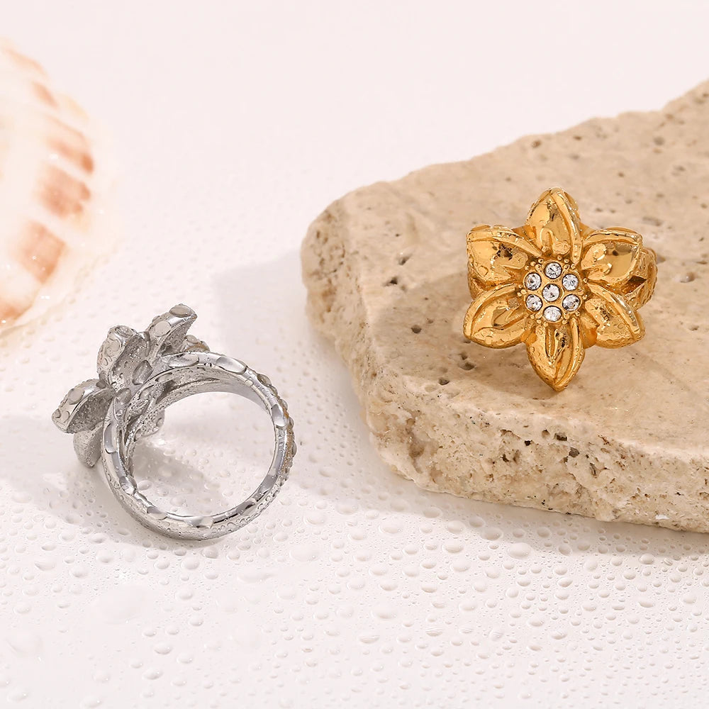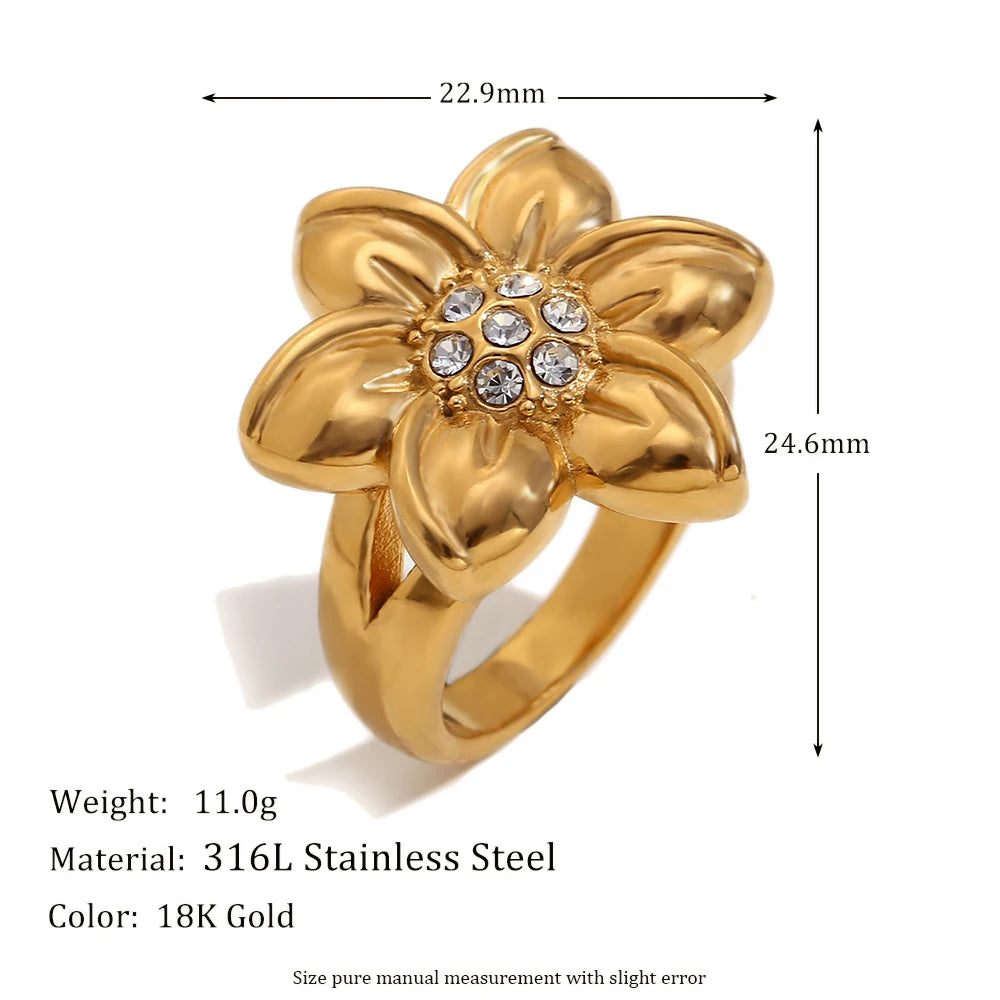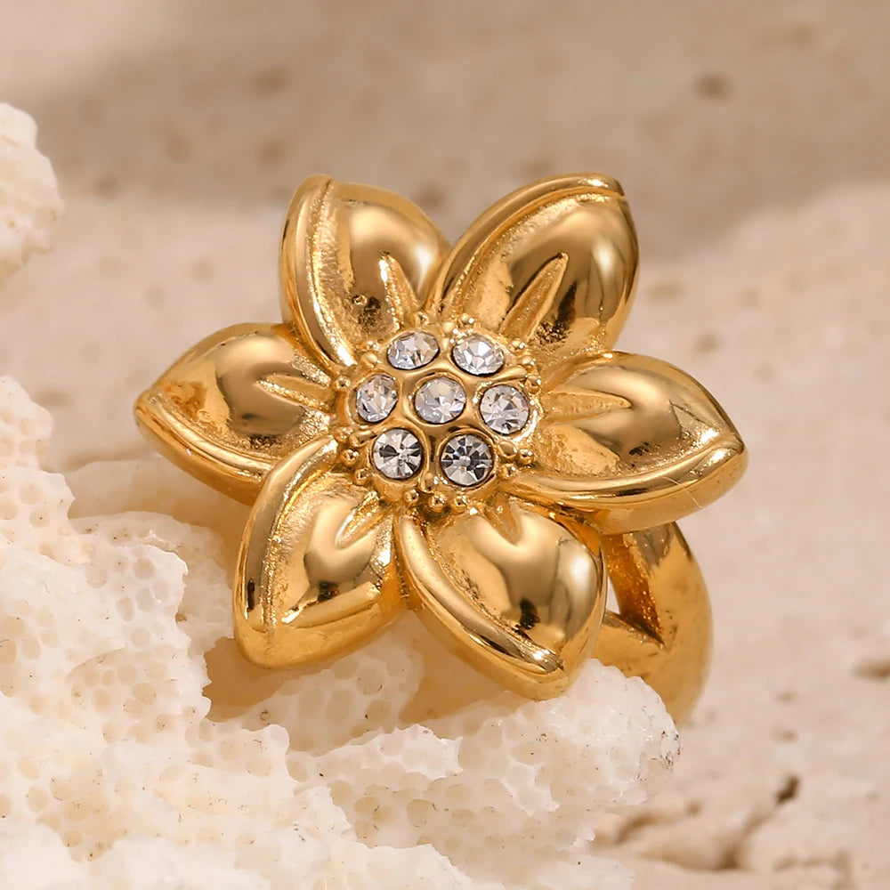 The Scarlet Aria ring blooms with elegance, featuring a radiant floral design adorned with sparkling crystals at its heart. Its golden petals catch the light beautifully, creating a look that feels both graceful and captivating. Perfect for adding a touch of timeless charm to your most special moments.