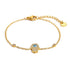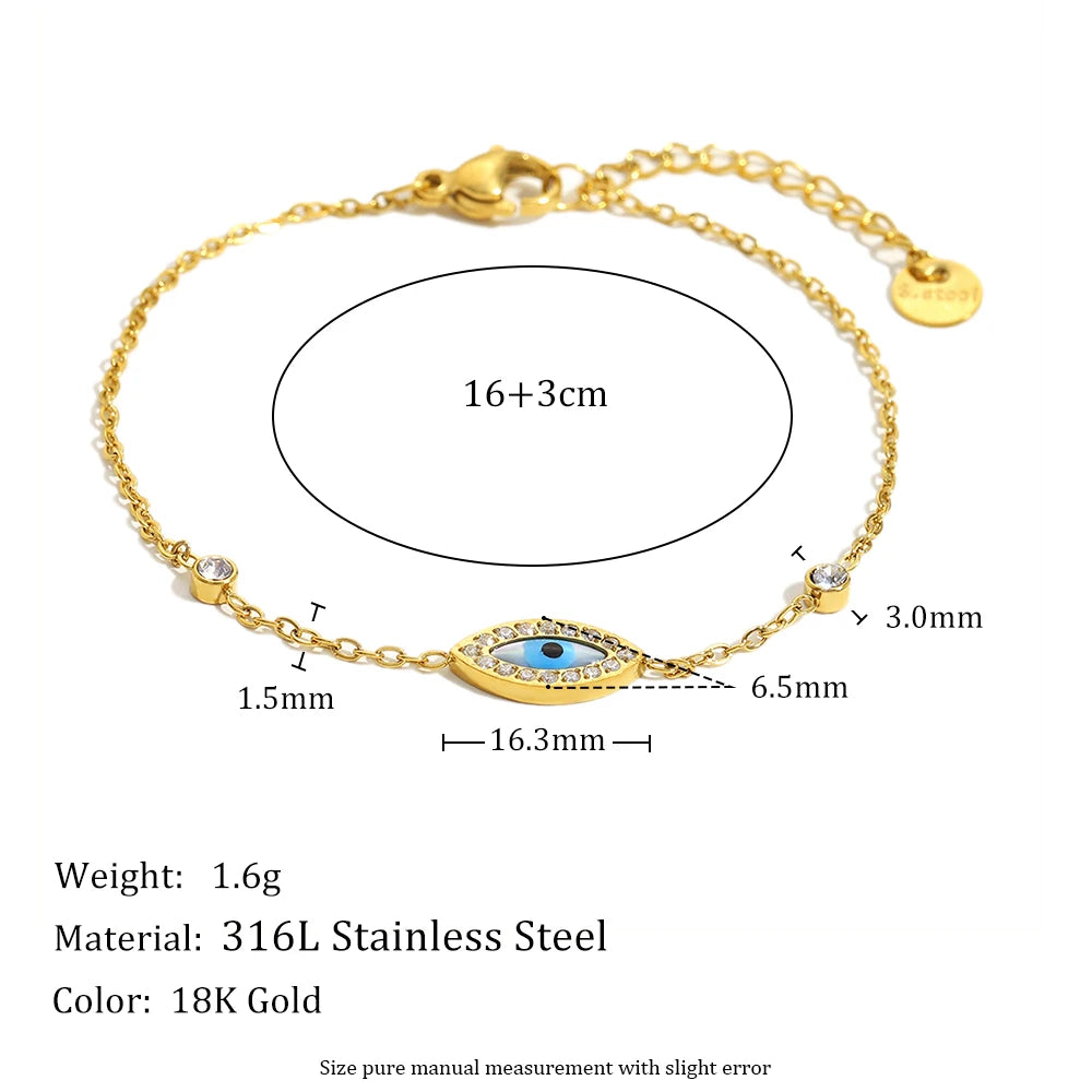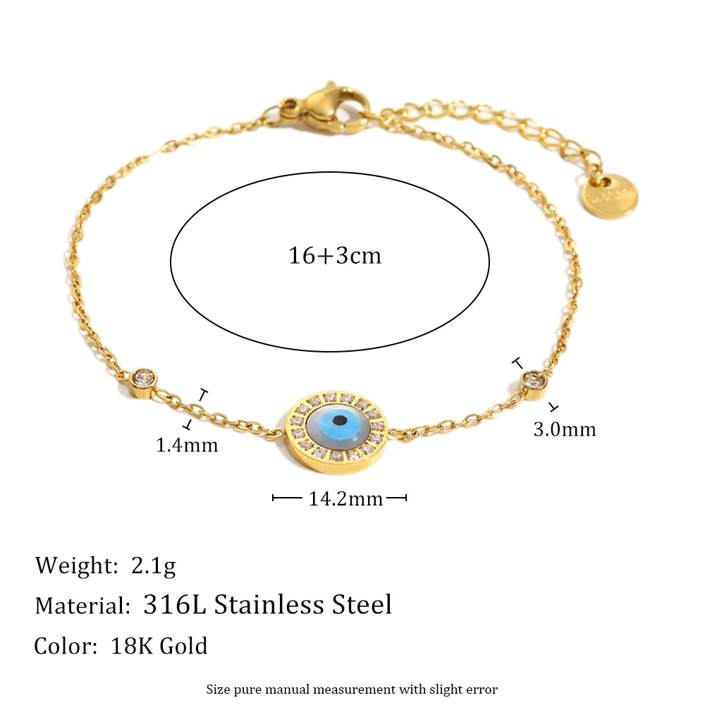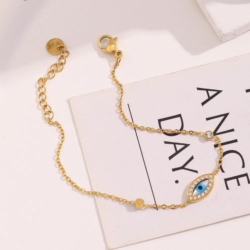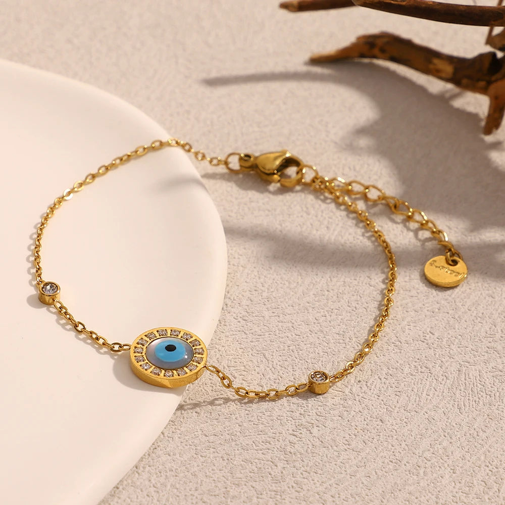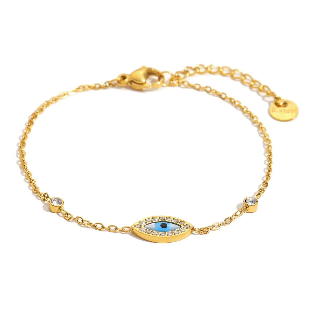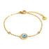 The Sky Eye bracelet offers a blend of beauty and protection, featuring a golden chain and an intricate blue evil-eye charm. A timeless talisman that adds style and meaning to any look.