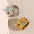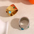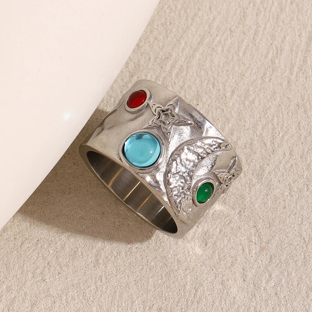 The Star Moon Wide Edge ring shines with cosmic elegance, featuring a bold golden band adorned with colorful stones, a crescent moon, and a radiant star. Its wide-edge design offers a striking statement, blending celestial charm with a touch of luxury. Perfect for adding a vibrant, artistic flair to any outfit.