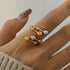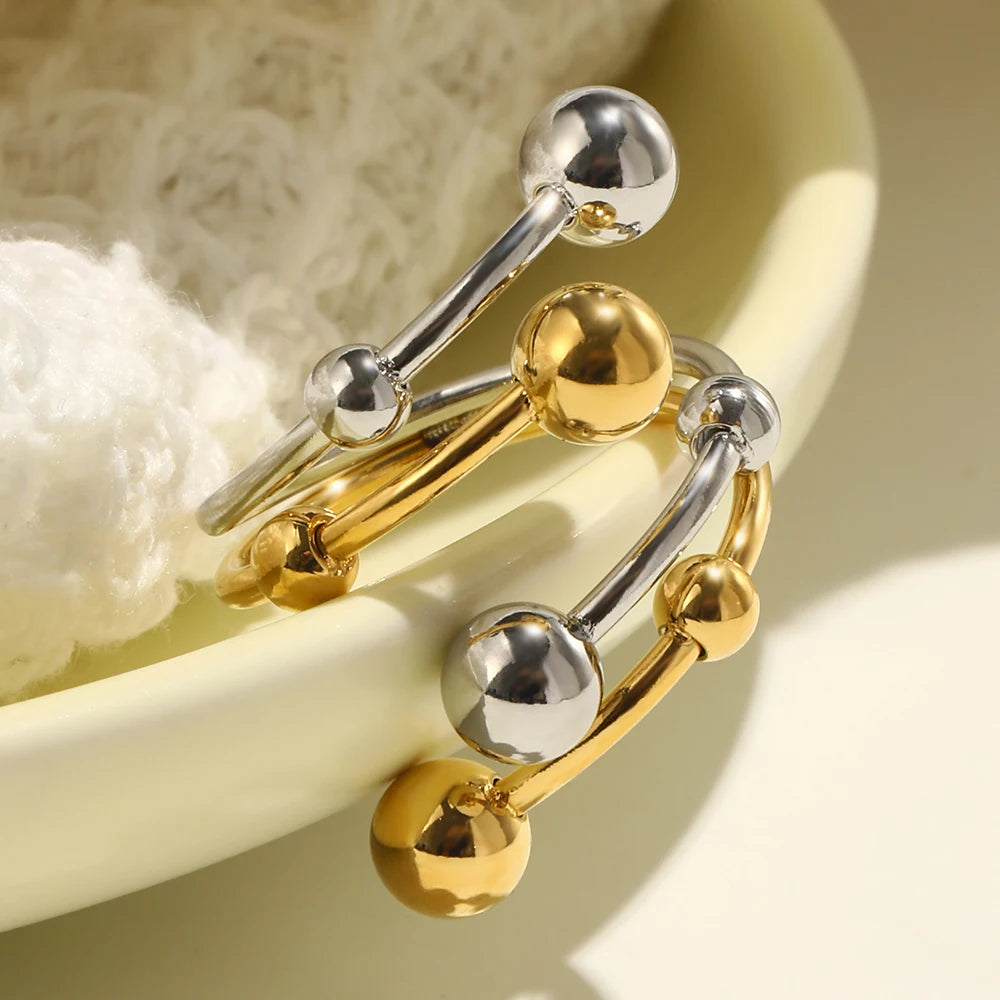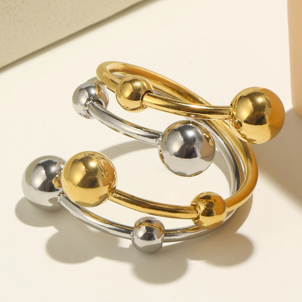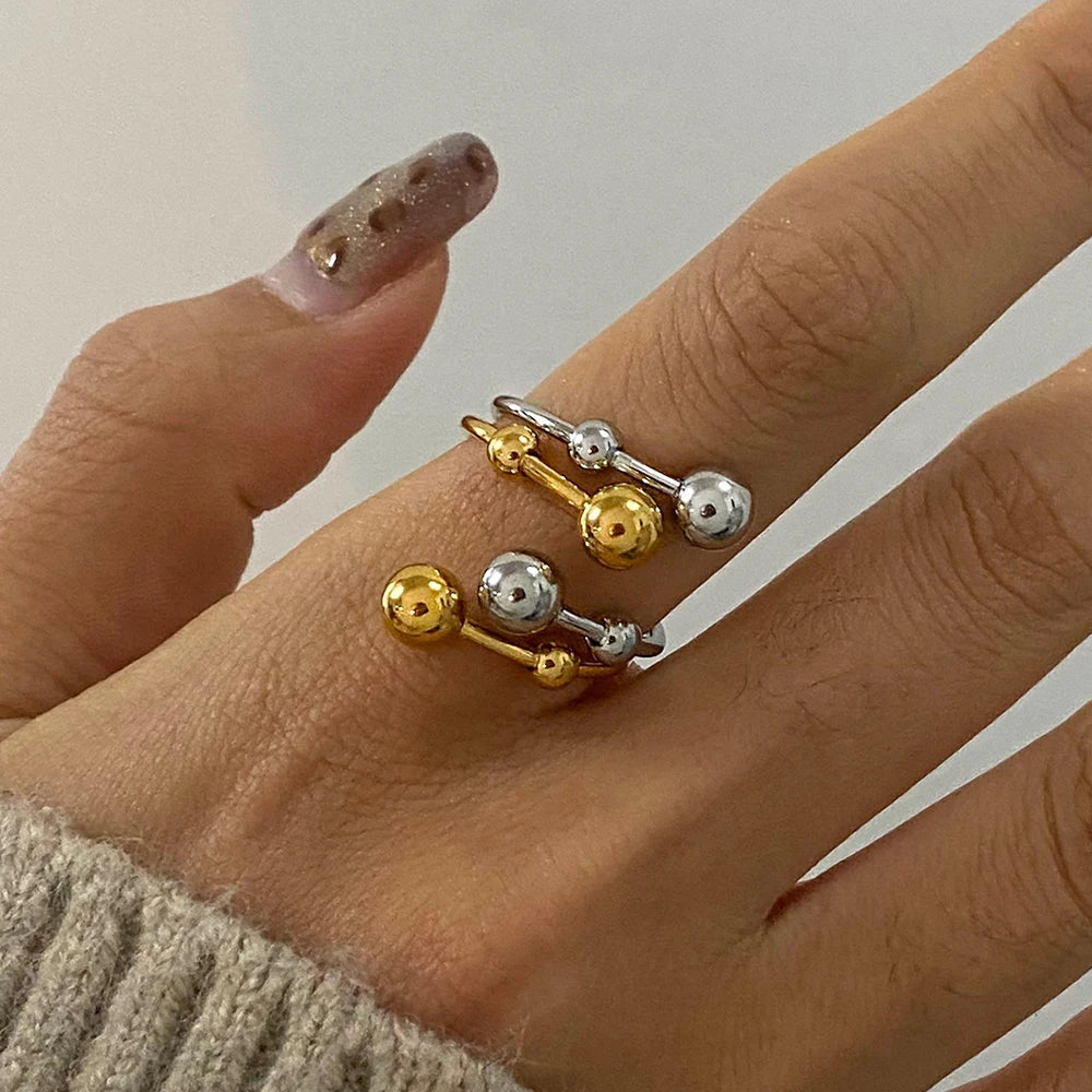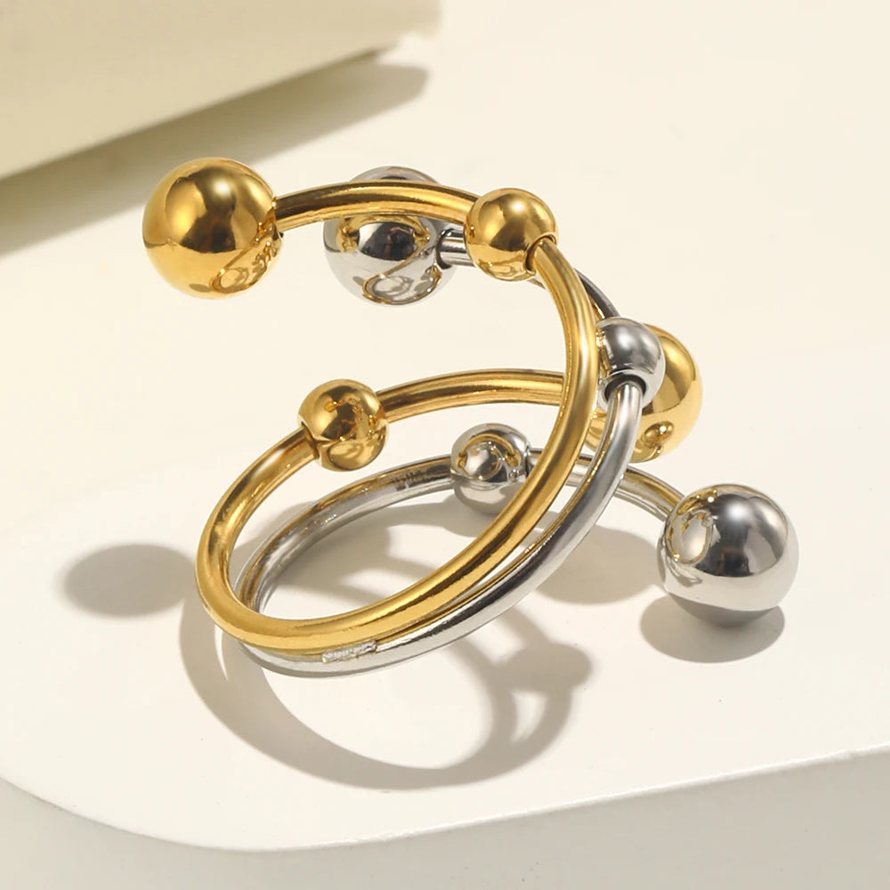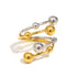The Starlet Bianca ring is a playful mix of elegance and modern style, featuring intertwining golden and silver tones with delicate sphere accents. Its sleek, open design makes it versatile for stacking or wearing solo, adding a refined yet contemporary touch to any outfit.